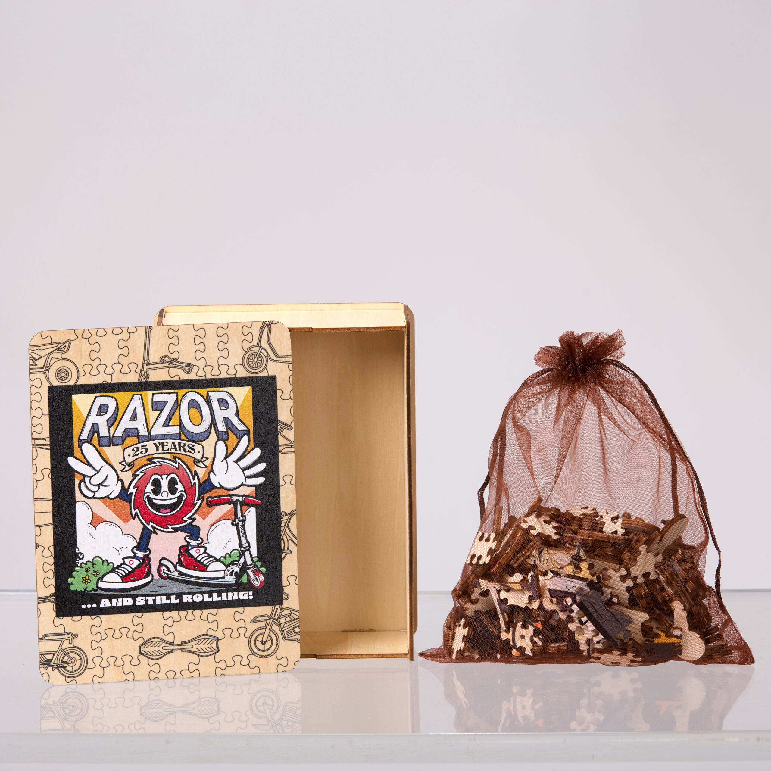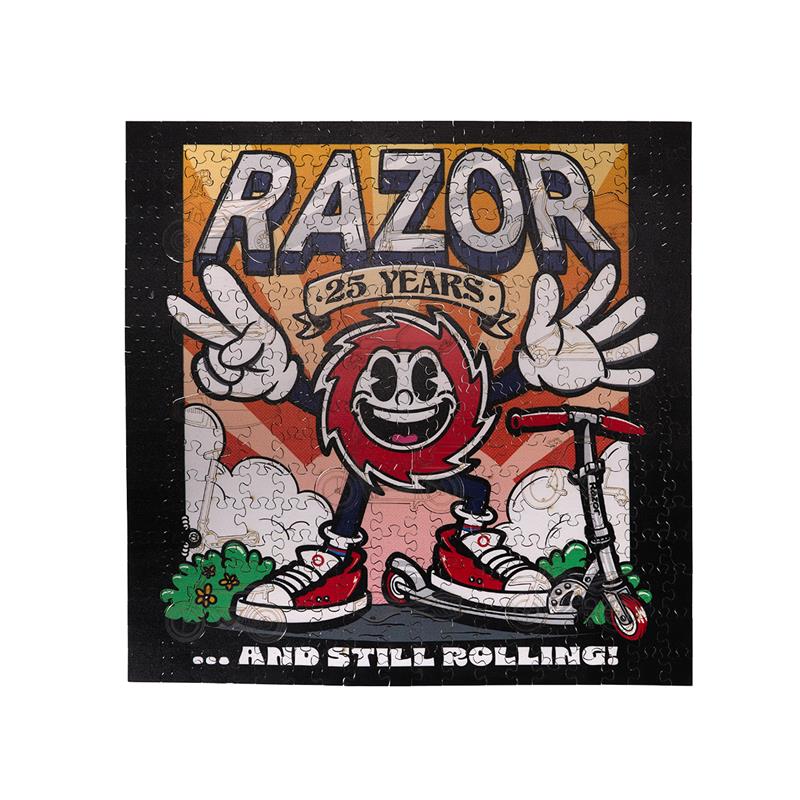 Designed to honor 25 years of innovation and family fun, this limited-edition wooden puzzle features 250 precision-cut pieces with 12 special pieces shaped like Razor’s most popular rides. A timeless keepsake that celebrates the people, products, and play that make up the Razor family.
